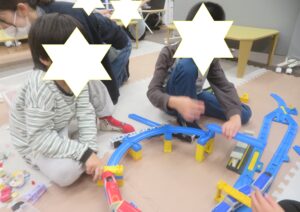 室内遊びの時間にはプラレール遊びが人気です♪